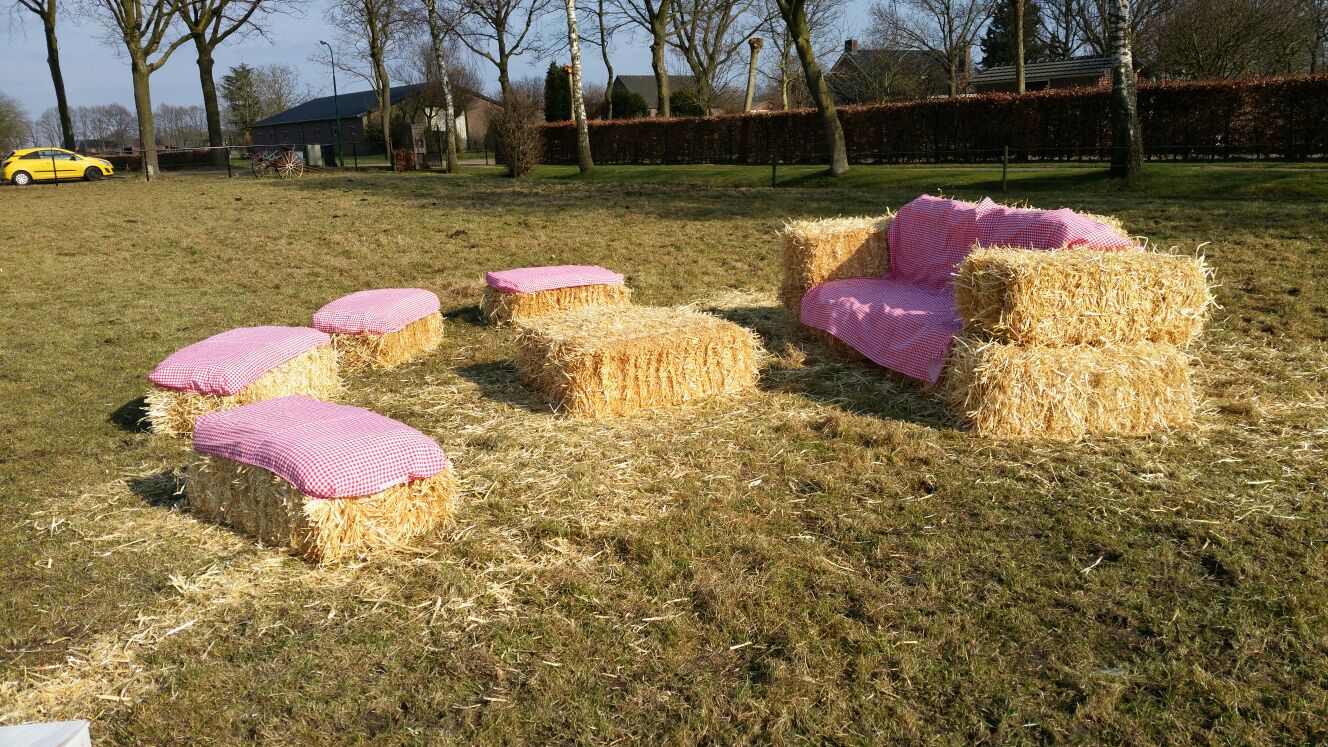 1 klein pakket bestaat uit 1 kleed van 1.40x2.80 voor een grote bank 10 hoesjes voor losse pakken stro. en 25 balen stro.