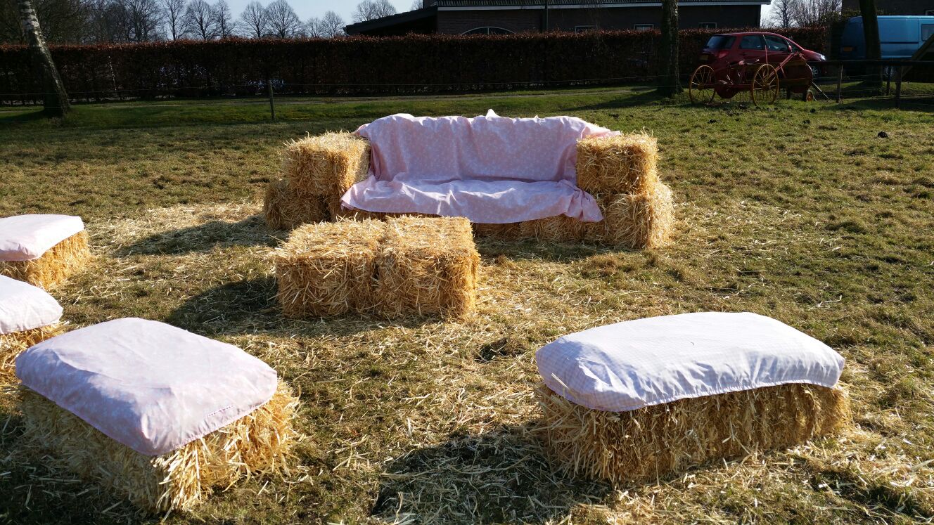 1 klein pakket bestaat uit 1 kleed van 1.40x2.80 voor een grote bank 10 hoesjes voor losse pakken stro. en 25 balen stro.